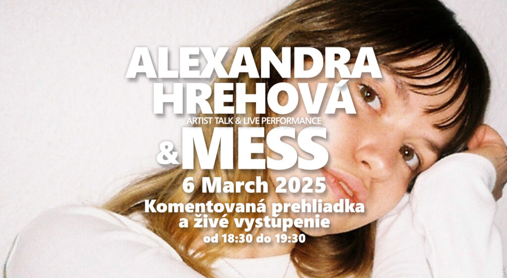 We would love to invite you to the artist talk happening on Thursday 6. 3. 2025 from 6:30 pm until 7 pm. Alexandra Hrehová and the curator Ivana Moncoľová will talk about the works of the exhibition Past-viny. Later, from 7 pm until 7:30 pm, the musician MESS will perform live.