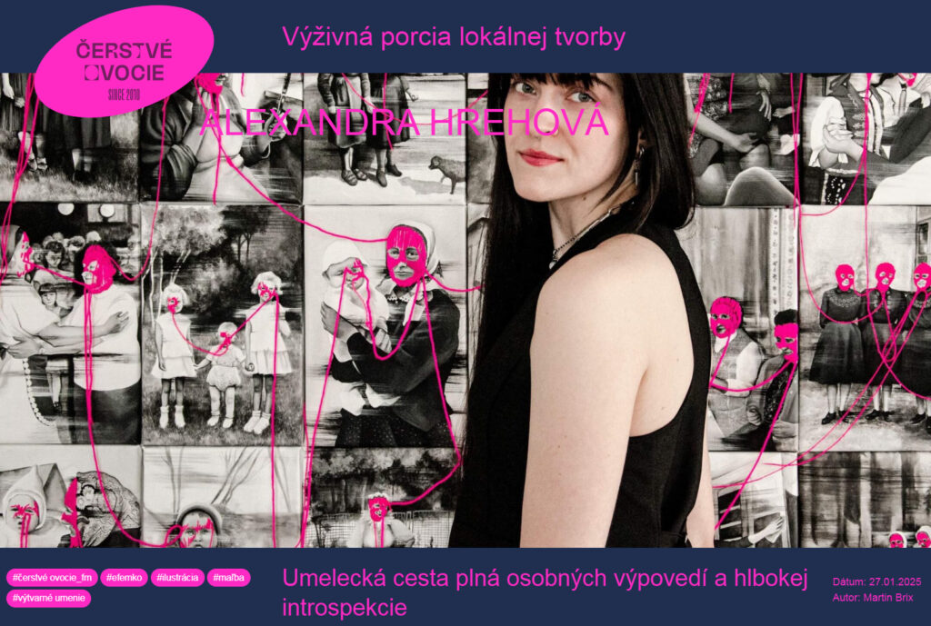 Although Alexandra Hrehová’s overall work is quite diverse in terms of themes and techniques, her current paintings deal with issues related to femininity and personal identity. She works mainly with figurative painting, where folkloric elements and motifs are regularly present, bridging the past and the present. A key symbol appearing in her works are masks, which she uses to cover the faces of women, including her own, while leaving space for viewers to imagine themselves behind the masks. By using masks, she points to the generational traumas of women and thus opens a dialogue on this issue, which has deep roots in our Slovak customs and traditions. In her works, she draws not only from collective memory, but also from personal experiences, seeking her own healing.